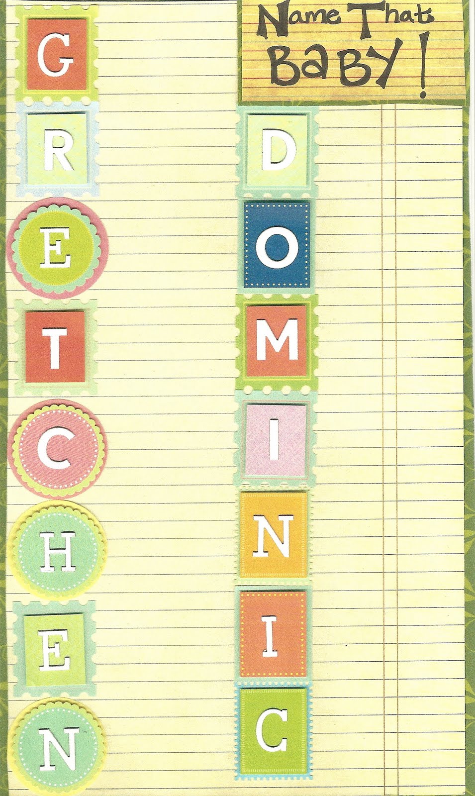 Each guest was given a copy of the above game card. And yes, in true Leah fashion they were homemade and simply adorable. Everyone was then told to think of girl names for all the letters in GRETCHEN and boy names for all the letters in DOMINIC. When time was up everyone shared the names they had come up with. If two people had the same name, they lost their point … so uniqueness was a big factor. Which is probably why we got names like Ichabod :)
