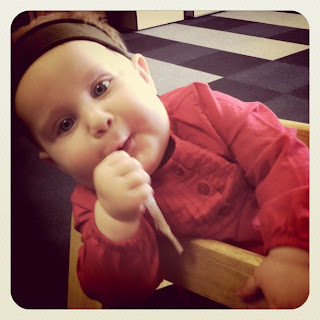 Out to lunch with Mama and Daddy, she is chomping on pizza crust. |