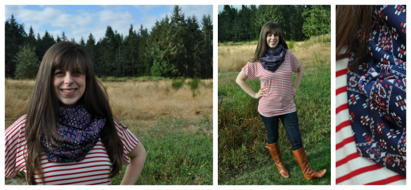 I had the honor of stylin’ up one of Korrine’s fabulous scarves. Isn’t it snazzy? I love the vintage pattern and feel like it adds that little extra something to a simple outfit. What do you think?